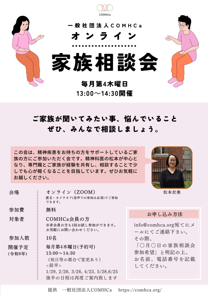 一般社団法人COMHCaでは、精神科医の松本が中心となり、ケアラーとしてのご家族が抱えている疑問や悩みについて相談し、少しでもほっとするような時間を持っていただく会を定期開催しております。
